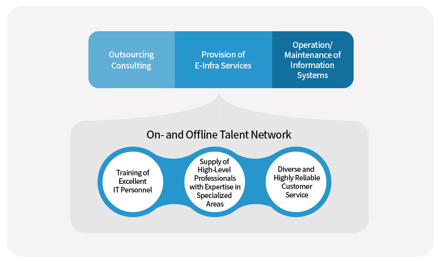 Through its extensive on- and offline IT talent network developed over many years, MCST strives to provide more diverse and reliable customer services by fostering excellent personnel who will serve as the cornerstone of next-generation IT businesses, and by supplying high-level professionals with project management skills and expertise in specialized areas. MCST prioritizes outsourcing consulting, provision of IT infrastructure services, operation and maintenance of information systems such as CRM, EDMS, and ERP, as well as the operation of systems that form the foundation of corporate information services and solving client-related issues.